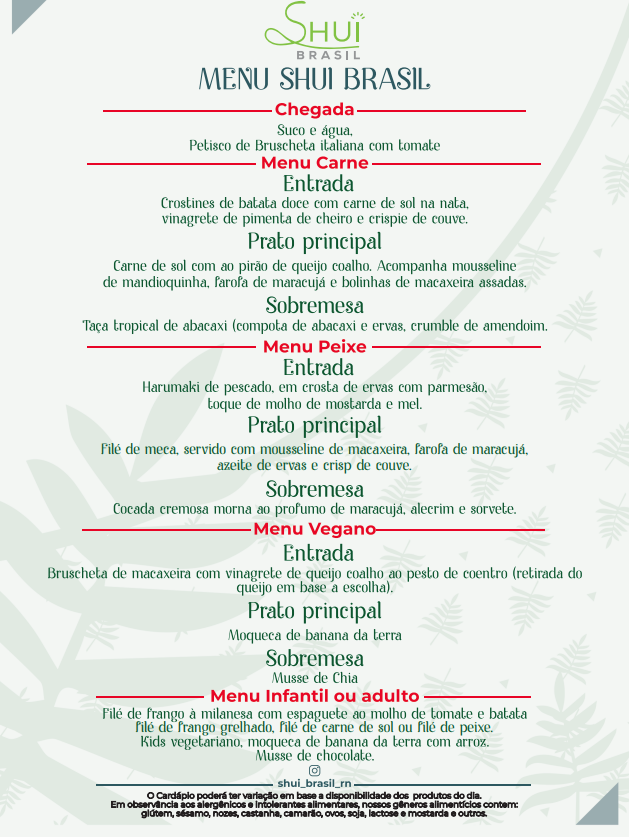 Em observância aos alergênicos e que possuem intolerância alimentar, nosso cardápio contém: glúten, sésamo, nozes, castanha, camarão, ovos, soja, lactose e mostarda.